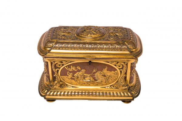 Cofre frances realizado en bronce dorado al mercurio con escenas en relieve de poseidon, siglo XIX. Largo 19cm.