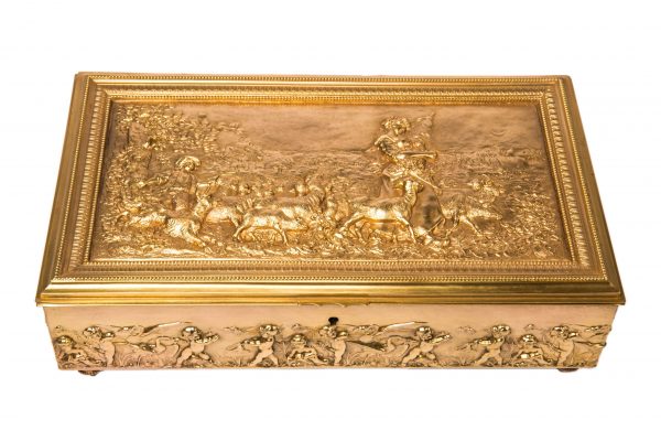 Cofre frances realizado en bronce dorado al mercurio con escenas en relieve, siglo XIX. Largo 26cm.