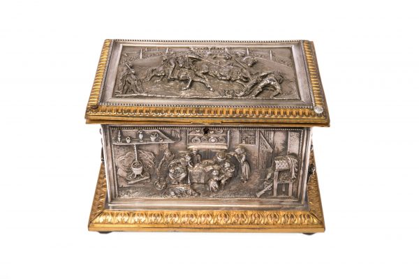Cofre francés en bronce plateado y dorado con escenas en relieve
