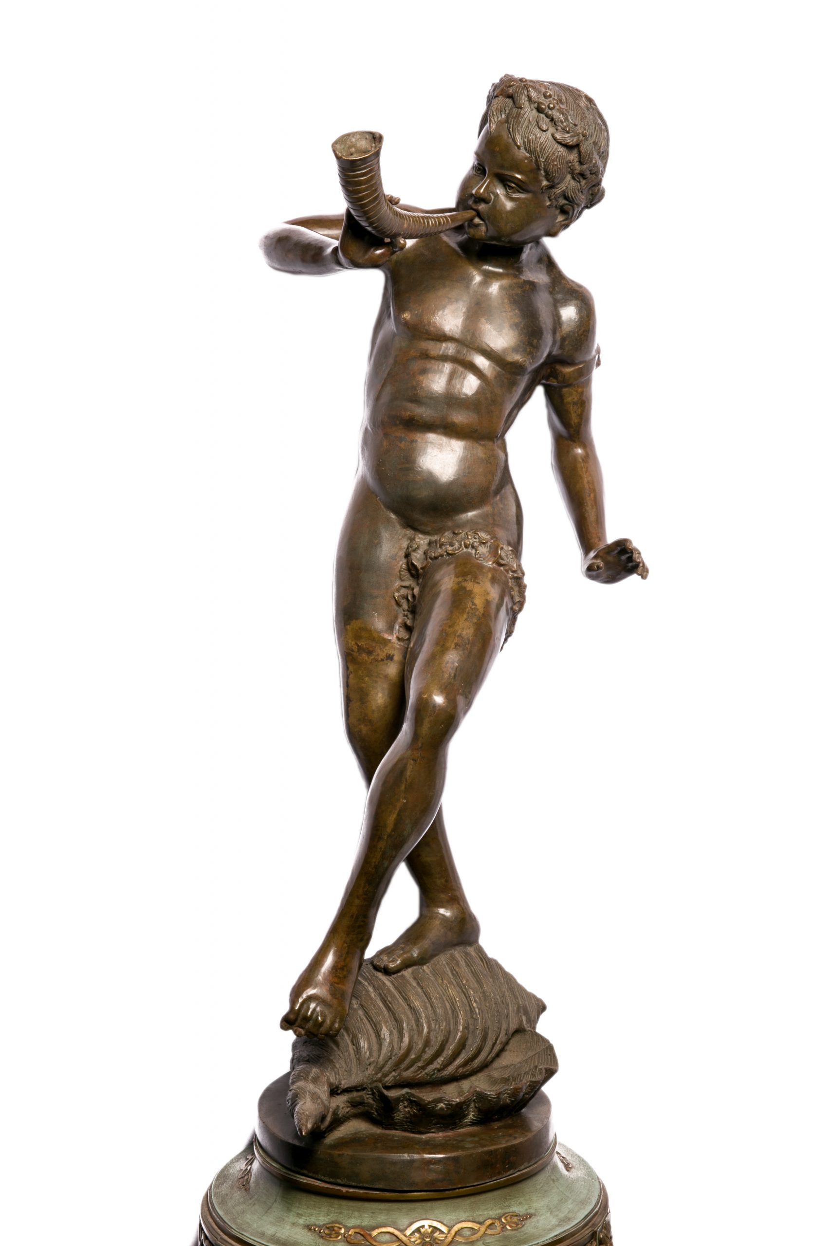 Escultura italiana realizada en bronce patinado “Niño tocando el cuerno”, siglo XIX. Altura 130cm.