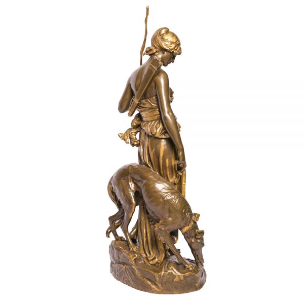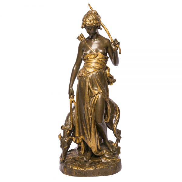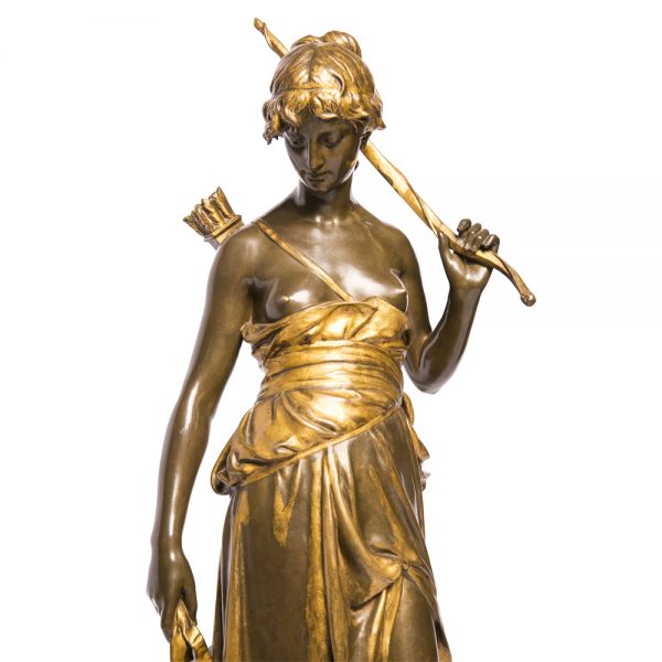 Escultura realizada en bronce patinado “Diana cazadora” firmada Aizelin, fundicion Barbedienne, siglo XIX, francia. Altura 82cm.