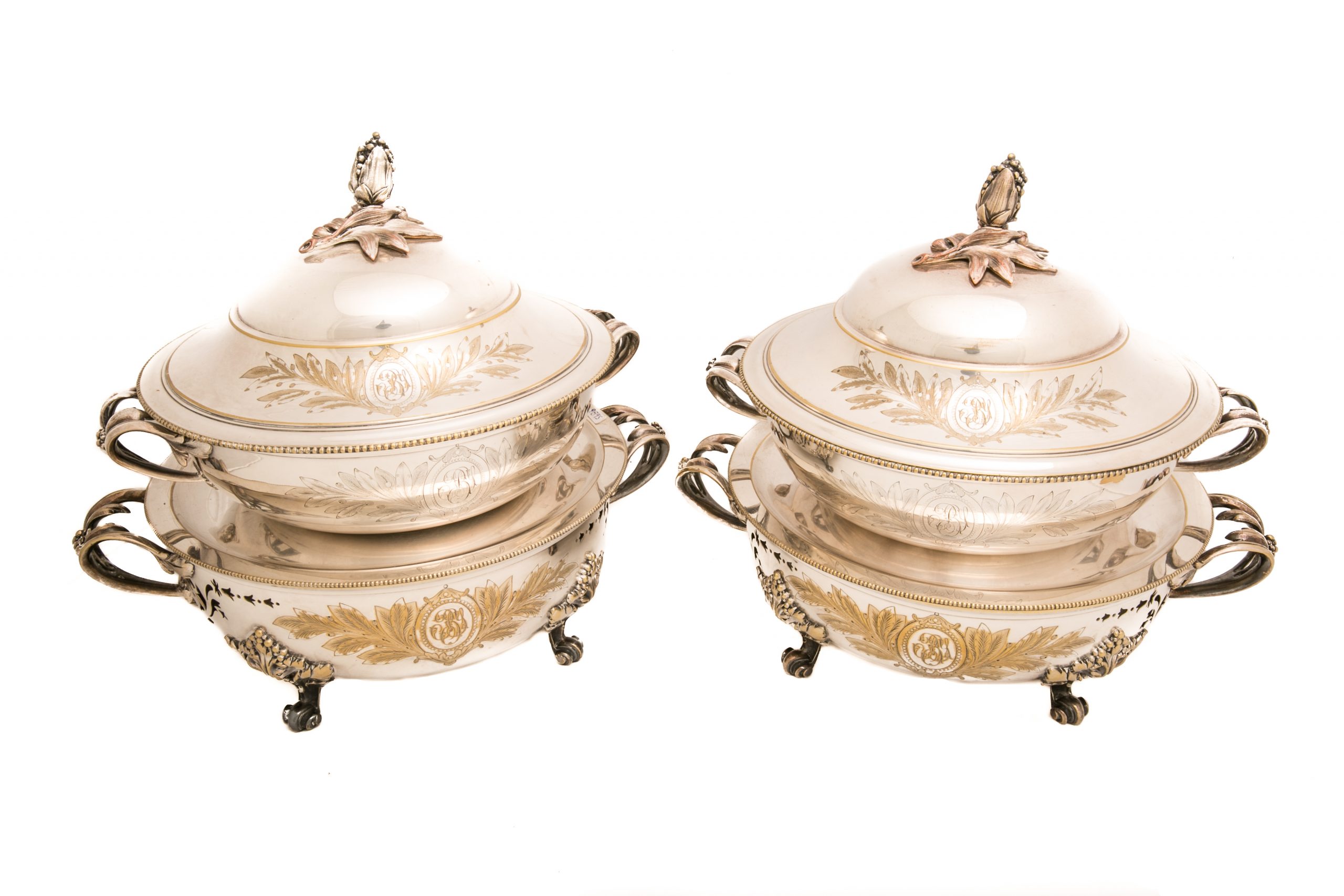 Par de guiseras con calentadores franceses manufactura Christofle, realziado en bronce plateado, siglo XIX.