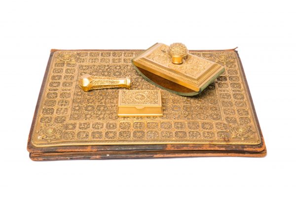 Juego de escribania frances realizado en filigrana de bronce dorado al mercurio, siglo XIX.