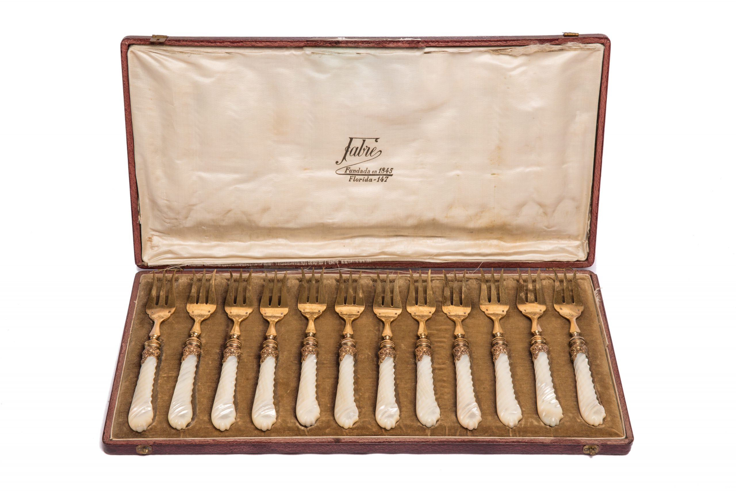 Juego de tenedores en plata vermeil francesa con mango de madre perla, siglo XIX.