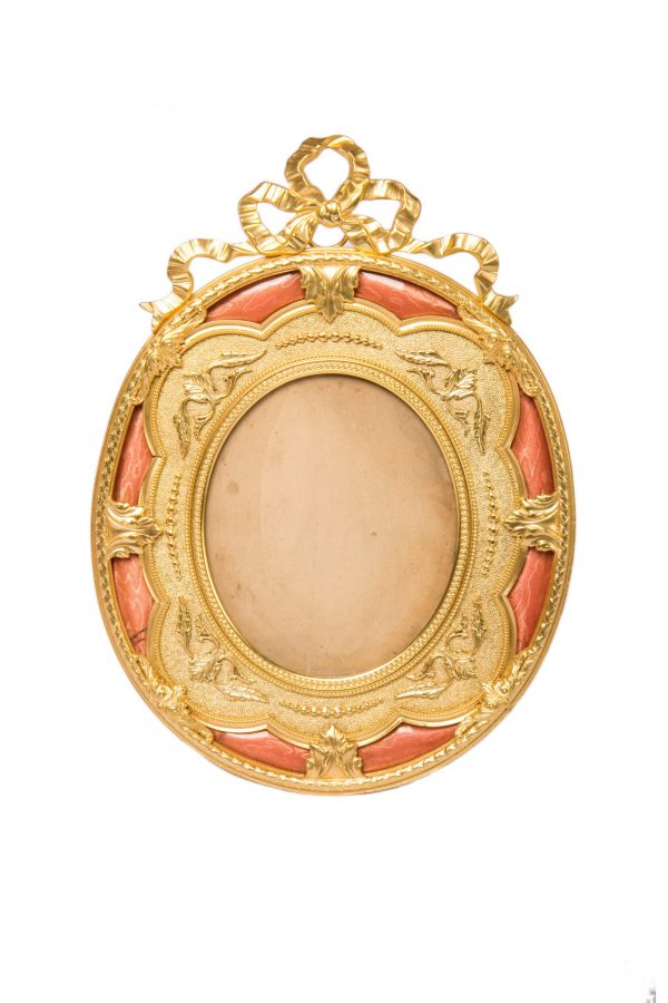 Portarretrato frances realizado en bronce dorado al mercurio y esmalte guilloche, siglo XIX. Altura 21cm.