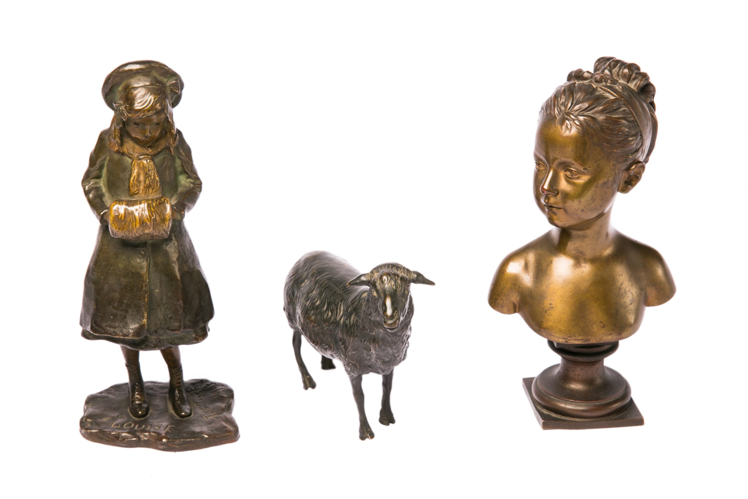 Tres esculturas de bronce patinado, “Louise” firmada Ferd Frick 1905 altura 24cm (izquierda) Oveja atribuida a Rosa Bonheur Largo 18cm alto 12cm(centro) Busto de niña firmado Houdon Altura 23cm (derecha)